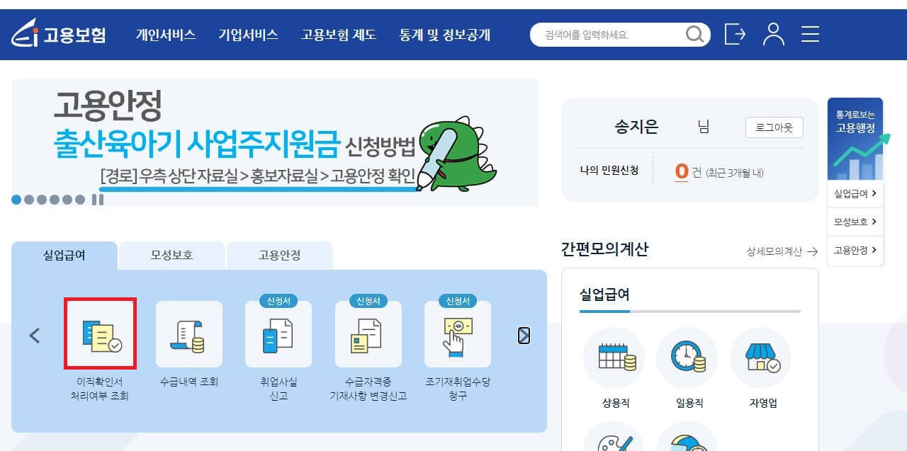 ✔ [이직확인서] 확인 - 고용보험 (https://www.ei.go.kr/ei/eih/cm/hm/main.do)