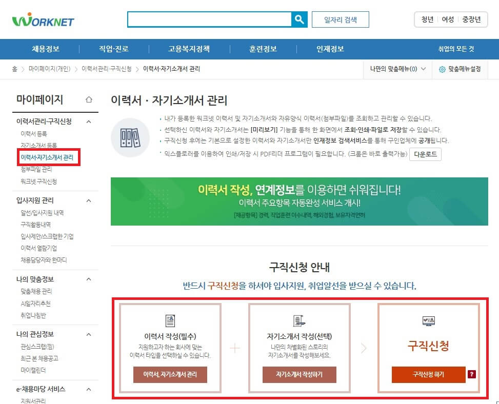 워크넷 사이트에 회원가입을 해줍니다. 마이페이지 / 이력서, 자기소개서 관리 페이지를 클릭한 후, 이력서와 자기소개서를 작성, 구직신청까지 해줍니다.